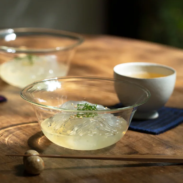 揺らぎがきれいなガラスボウルと自然と手に収まるかたちの陶器のカップ