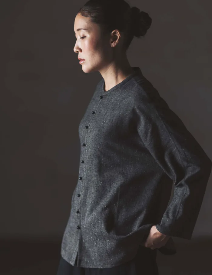 布で作ったボタンが特徴の ポケットが便利なジャケット