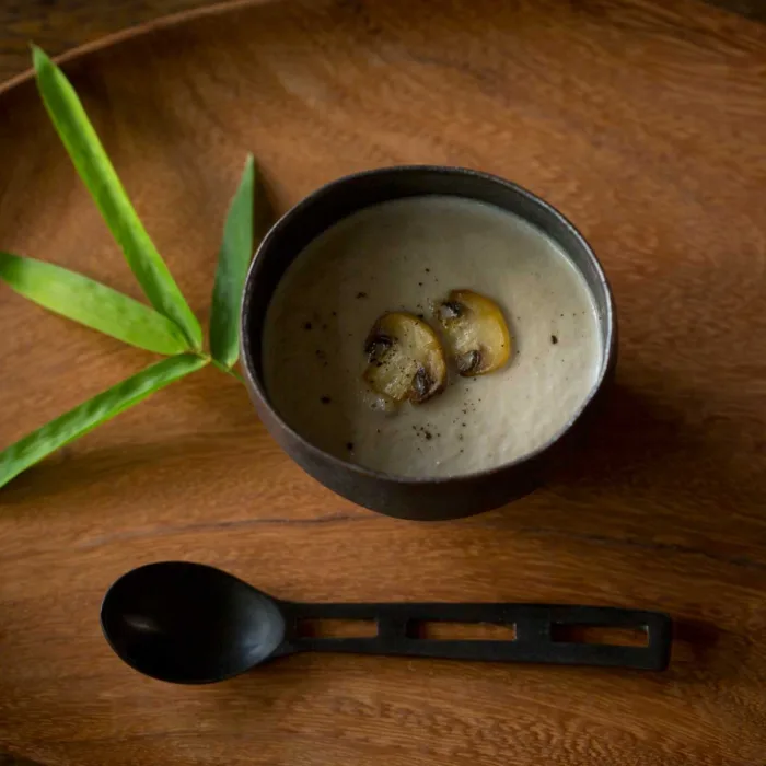 ヨーガンレール食堂を切り盛りする松長さんのマッシュルームのポタージュ レシピを添えて