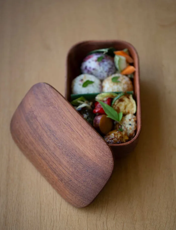 お弁当箱は無垢の木材を手で彫った小ぶりな箱で