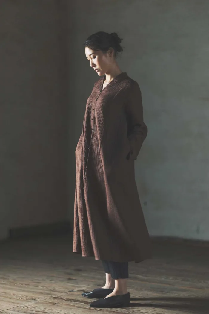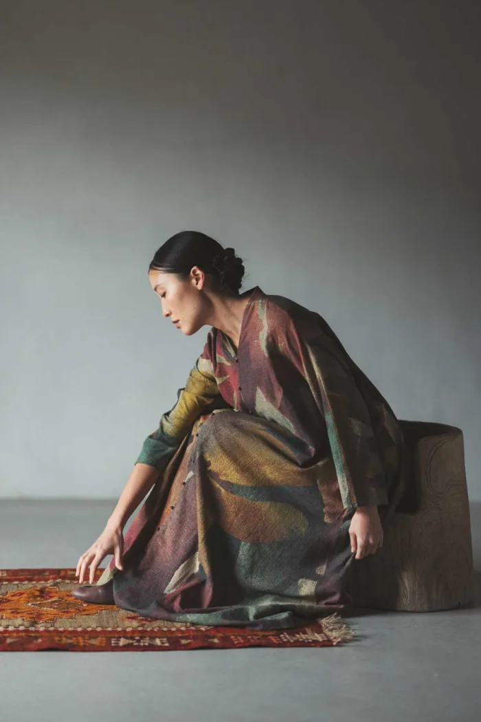 里山の木々の一枝を 刺しゅうしたゆったりとした前開きのドレス